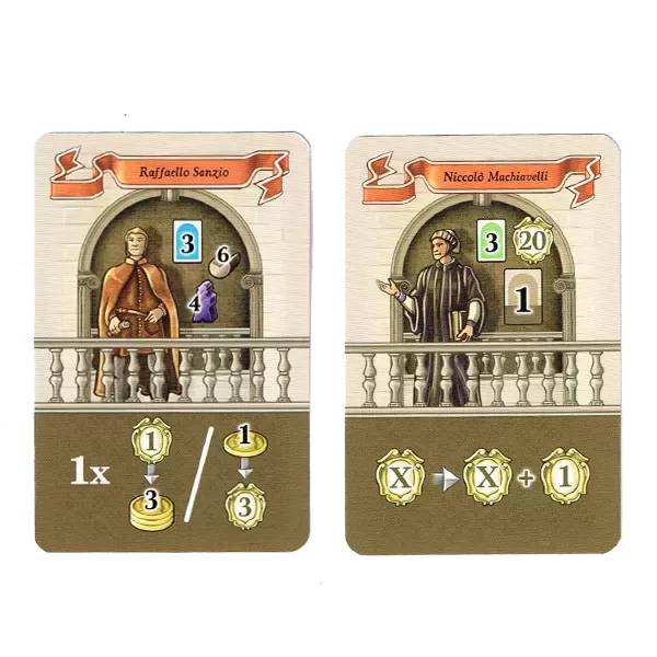 Cranio Creations (2023)This promo for Lorenzo il Magnifico adds 2 new leaders (Raffaello Sanzio & Nicolo Machiavelli) to play with the base game.