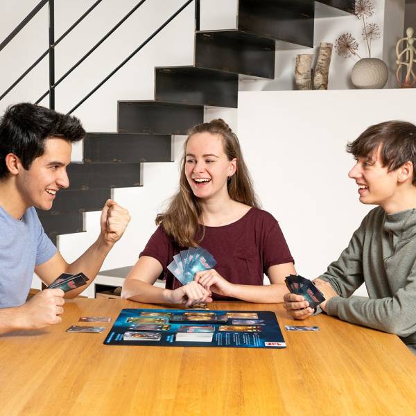 Das Spiel insgesamt ist dann ein feiner Zeitvertreib, der ein paar Runden beschäftigen kann, aber möglichst nur in Vollbesetzung. Zu Zweit zieht sich das Spiel und kann u.U. frustrieren, wenn nicht die passenden Karten gezogen werden (worst case einige Male erlebt: um überhaupt Planeten anlegen zu können, muss zuerst eine „1“ angelegt werden, dann entspr. folgende Werte (s.o.), wenn aber niemand eine „1“ hat, passiert nichts und wenn alle „1“er ganz unten im Nachziehstapel verweilen, wird es öde und zeitlich eng; bei 4 Spielern ist die Wahrscheinlichkeit einfach höher, dass bessere/passendere Karten ins Spiel kommen – nach Rücksprache mit dem Verlag kommt evtl. eine Änderung, bei der in 2-Spieler-Spielen die Kartenhand vergrössert wird). Wenn das Spiel läuft und die Sonderkarten eingebracht werden, füllt sich der Spielverlauf mit einiger Abwechslung und genehmer Hektik.