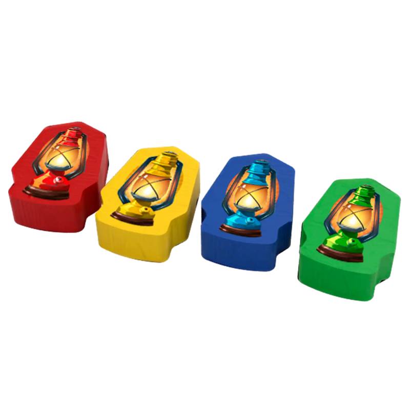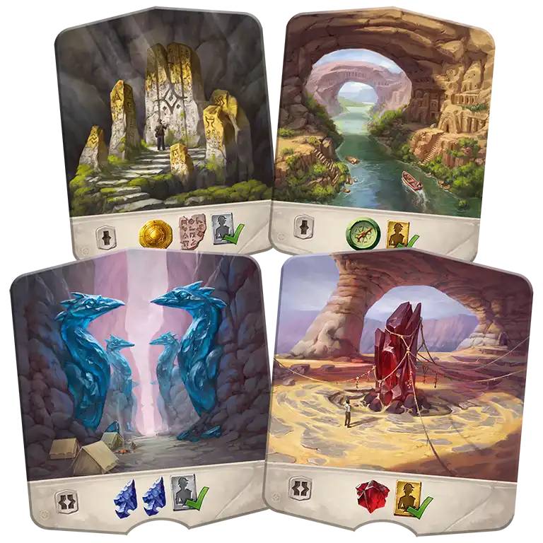 On the map, you can choose to explore its daytime side and scale the white stone of the Owl Temple. It uses unique new temple tiles that, if combined together, can become extra idol slots, and a third research token, a lantern, that brings even stronger research rewards. You can also brave the night and journey through the dark caverns of the Spider Temple. This side uses a new resource, dark tablets, used to invoke mysterious altars and place artifacts directly onto the research track to be used when ascending the track. But beware—using the dark tablets can give you strong rewards, but also cost you points should you become too ambitious!