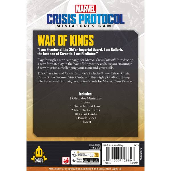 Atomic Mass Games (2025)Eine brandneue Kampagne für Marvel: Crisis Protocol! Mit diesem Pack taucht ihr in die „War of Kings“- Saga ein und spielt 5 spannende Szenarien, die euer Team und eure Fähigkeiten herausfordern. Dieser Charakter- und Krisenpack enthält 5 neue Evakuierungskrisen, 5 neue Sicherungskrisen und den mächtigen Gladiator. Stellt euch einer epischen Kampagne in Marvel: Crisis Protocol!