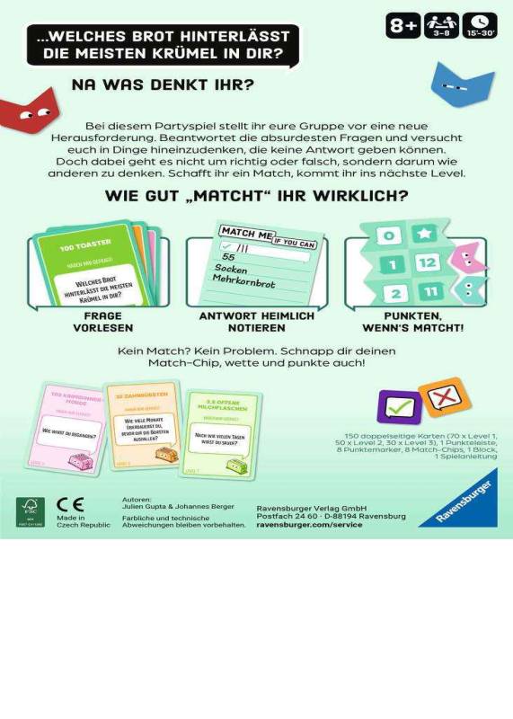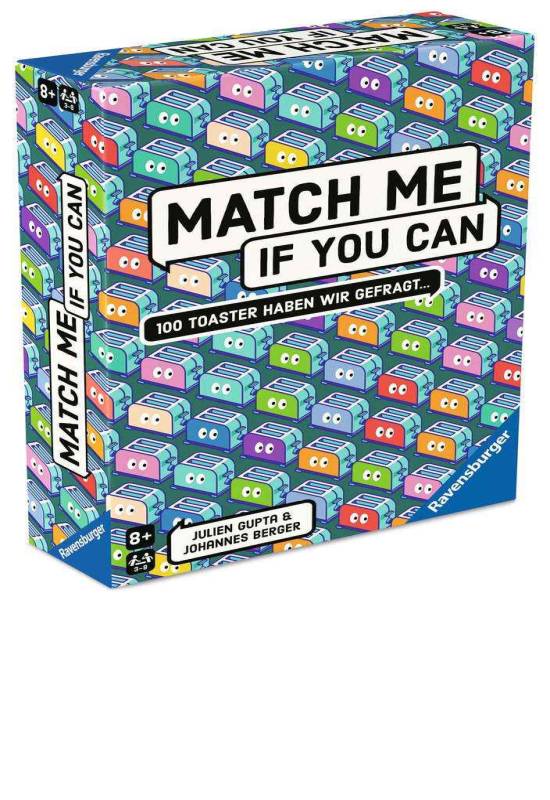 Ravensburger (2025)"Match Me - Das Partyspiel mit High Five-Garantie. 300 kuriose Fragen bieten nicht nur Gesprächsstoff sondern auch witzige Momente zwischen Spielern.