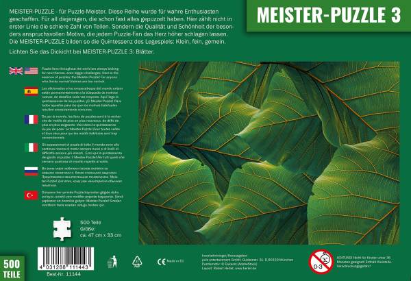 MEISTER-PUZZLE - für Puzzle-Meister. Diese Reihe wurde für wahre Enthusiasten geschaffen. Für all diejenigen, die schon fast alles gepuzzelt haben. Hier zählt nicht in erster Linie die schiere Zahl von Teilen. Sondern die Qualität und Schönheit der besonders anspruchsvollen Motive, die jedem Puzzle-Fan das Herz höher schlagen lassen.