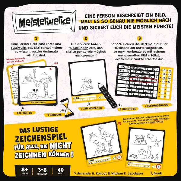 Bei diesem witzigen Zeichenspiel für alle, die nicht zeichnen können, übernimmt ein Spieler die Rolle des Beschreibers. Dieser muss den Mitspielern innerhalb von 90 Sekunden ein Bild beschreiben, welches die angehenden Künstler so genau wie möglich nachzeichnen.