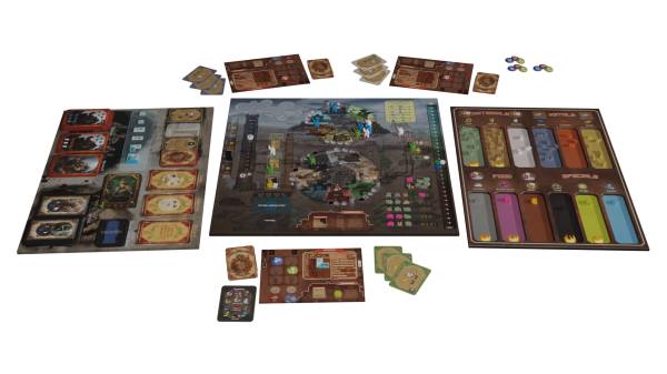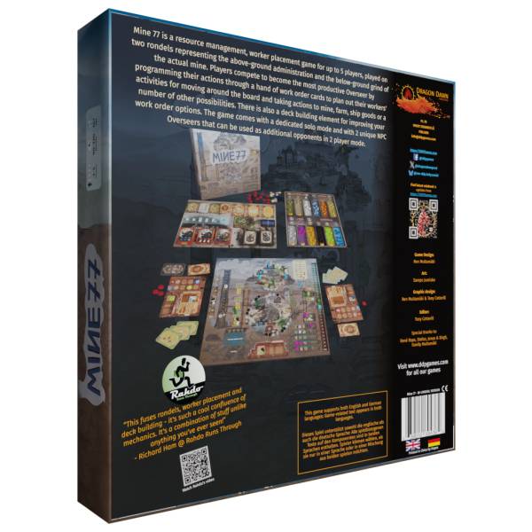 Dragon Dawn Productions (2025)Mine 77 ist ein eigenständiges Prequel zu Factory 42, in dem Sie die herausfordernde Rolle eines Aufsehers in Odrixias größtem Bergwerk übernehmen. Navigieren Sie durch Regierungsauflagen und verhandeln Sie mit anderen Aufsehern, während Sie sich selbst bereichern. Das Gameplay von Mine 77 dreht sich um zwei miteinander verbundene Rondelle – eine unterirdische Produktionsrondelle und eine oberirdische „Stadt”-Rondelle. Das Spiel nutzt einen simultanen Aktionsauswahlprozess mit Arbeitsauftragskarten. Es gibt einen Anreiz zur Zusammenarbeit und Interaktion mit Ihren Kollegen, da die Regierung in jeder zweiten Runde überprüft, ob die Aufseher gemeinsam das gesetzte Ziel erreicht haben – und gegebenenfalls gemeinsam die Faulenzer bestraft. Ein hinterhältiger Aufseher kann sich entscheiden, der kollektiven Bestrafung zu entgehen, indem er Rosetten (Zeichen der gemeinschaftlichen Wertschätzung) sammelt.