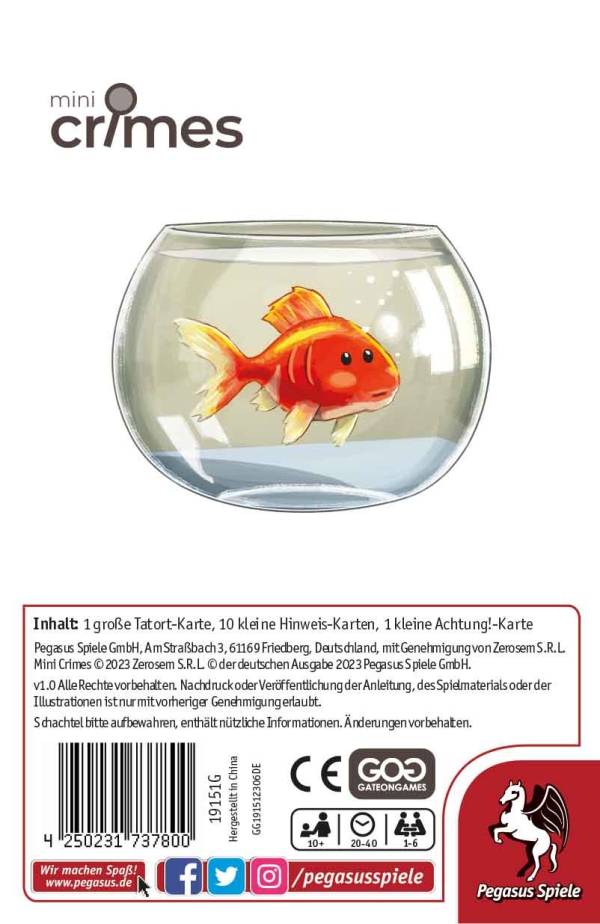 Pegasus Spiele (2024)Die MiniCrimes Fälle sind kooperative Krimispiele, in denen die Spielenden ihre Beobachtungsgabe und ihre detektivischen Fähigkeiten unter Beweis stellen müssen, um einen mysteriösen Fall zu lösen. Sie untersuchen dabei den Tatort und bis zu 10 Hinweise, die sie mit Bedacht auswählen müssen, um das Geheimnis zu lüften!