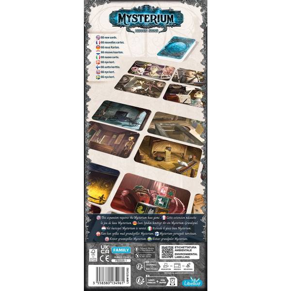 Libellud Die Erweiterung Hidden Signs zum Familienspiel Mysterium bietet jeweils 16 neue Täter-, Tatort- und Tatwaffekarten. Außerdem sind 42 neue wunderschön illustrierte Visionskarten enthalten.