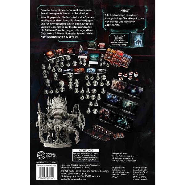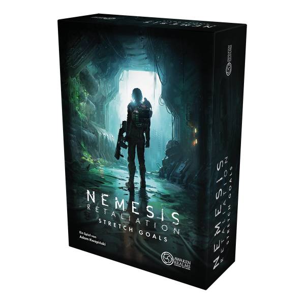 Awaken Realms (2025)Nemesis: Retaliation – Stretch Goals erweitert euer Spielerlebnis mit drei neuen Erweiterungen für Nemesis: Retaliation! Kämpft gegen den Neobrut-Kult – eine Spezies intelligenter Maschinen, die Menschen jagen und für ihr Wachstum einverleiben. Erlebt die variable Geschichte der Insiderin mit immersivem Storytelling. Entdeckt die Söldner-Erweiterung, um die legendären Charaktere früherer Nemesis-Spiele auch in Retaliation zu spielen!