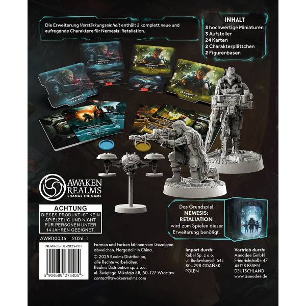 Awaken Realms (2025)Mit der Verstärkungseinheit-Erweiterung für Nemesis: Retaliation erhaltet ihr zwei spannende neue Charaktere: den Drohnenpiloten und den Scharfschützen.