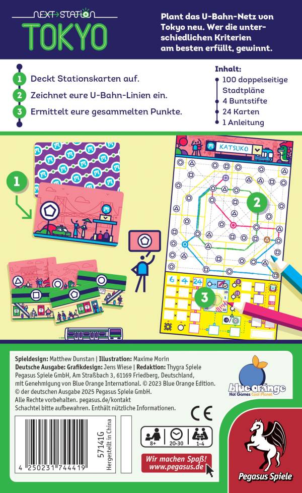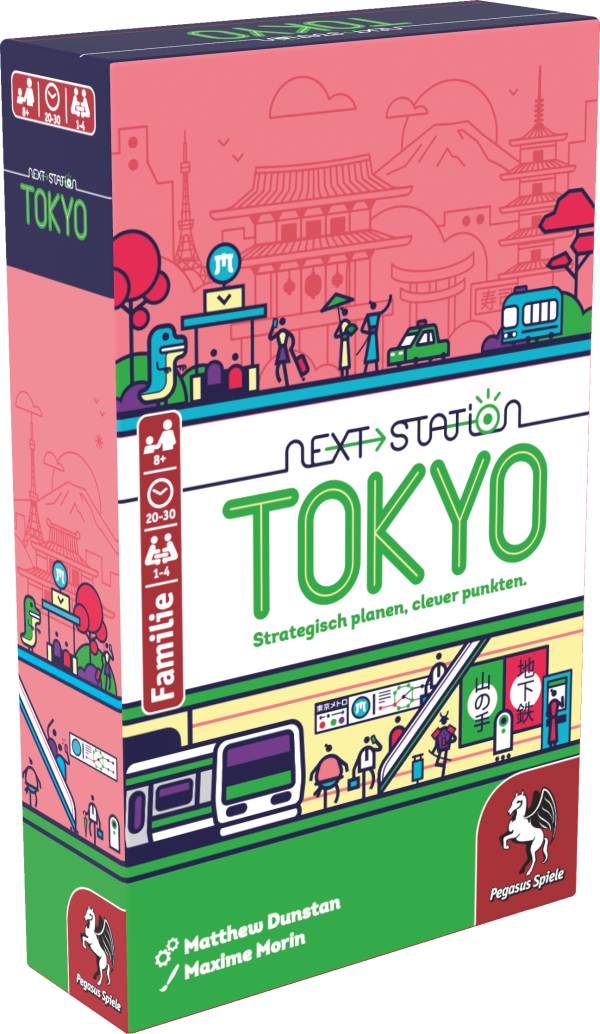 Pegasus Spiele (2025)Bei Next Station Tokyo geht es darum, ein neues U-Bahn-Netz für die Stadt zu entwerfen. Dabei versuchen die Spielenden möglichst viele Stadtbezirke zu verbinden und auch der Stadtbezirk mit den meisten Haltestellen bringt bei dem Flip-&-Write-Spiel Punkte ein. Besonders kniffelig ist in diesem Teil der Next Station Reihe die bereits eingezeichnete Yamanote-Linie, die auch im echten Tokyo rund um den Zentralbezirk verläuft, da sie genauso wie die anderen Linien nicht gekreuzt werden darf. Der Zentralbezirk muss daher mithilfe von nur acht Umsteigestationen mit den touristischen Randbezirken verknüpft werden. Nach vier Durchgängen mit jeweils fünf bis zehn Runden ist das neue U-Bahn-Netzwerk fertig gestaltet und wird anschließend von der Stadtverwaltung beurteilt.