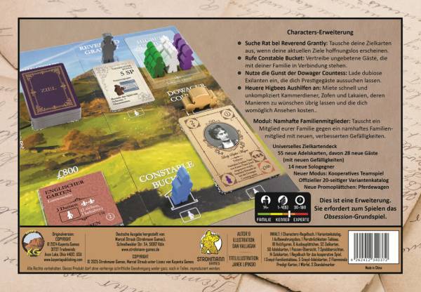 Strohmann Spiele (2025)Eine extravagante Dowager Countess lebt außerhalb von Derby in einem stattlichen Anwesen, das geschmacklos im Stile eines schottischen Schlosses gehalten ist. Noch geschmackloser ist allerdings die Auswahl der Bewohner: Ein illustres Ensemble exzentrischer Personen aus ganz Europa und dem ganzen Empire nutzt das Anwesen als Zufluchtsstätte.