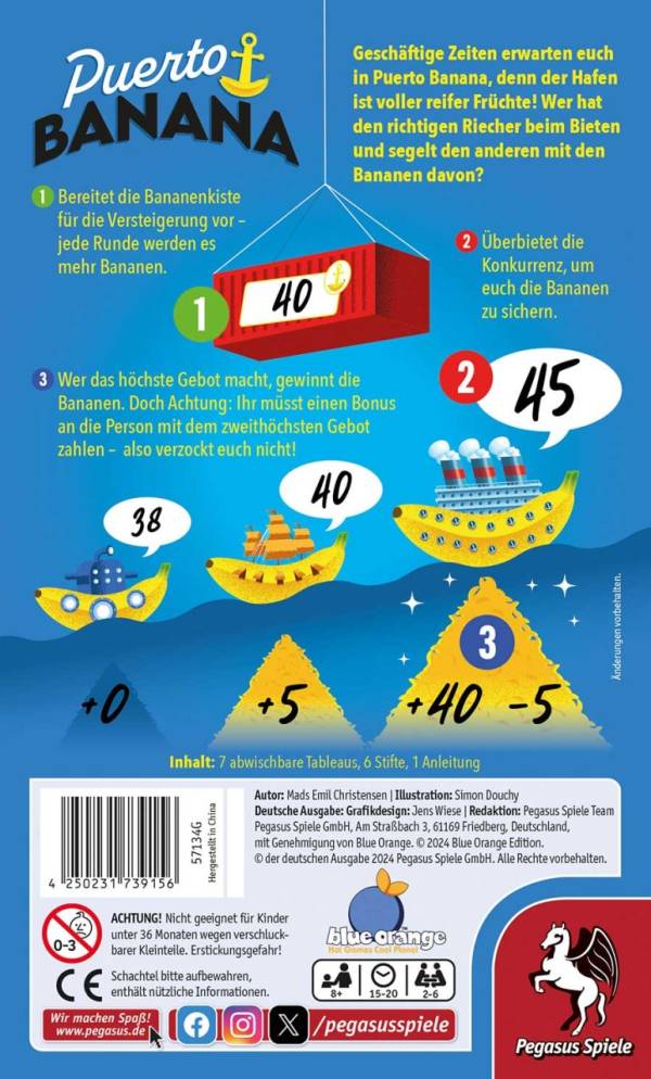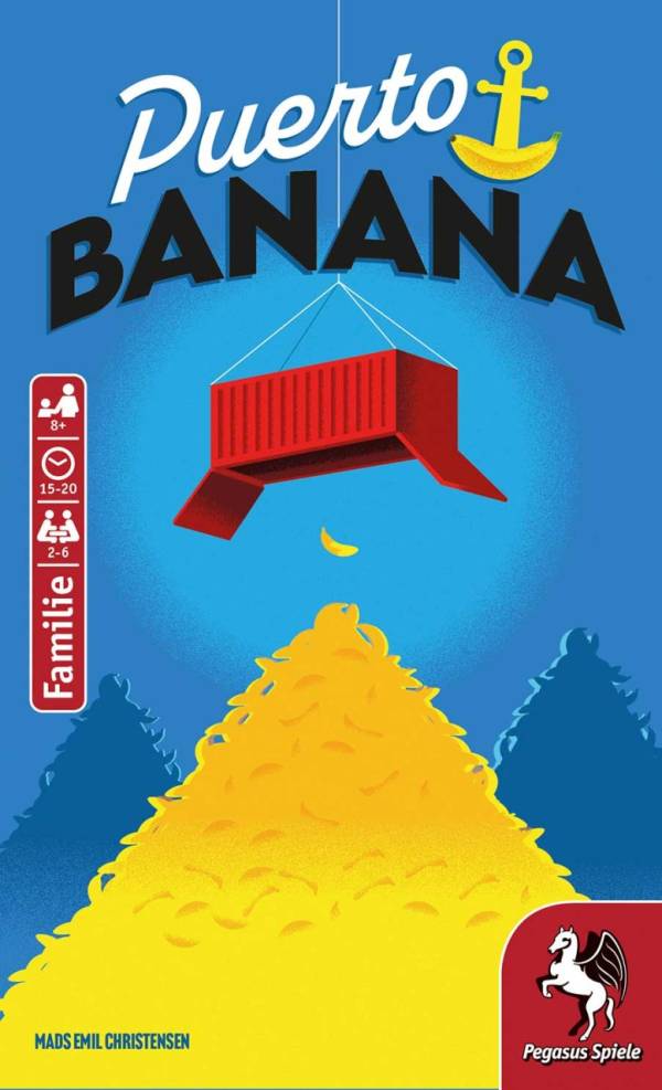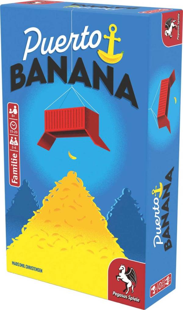 Pegasus Spiele (2024)Endlich ist es so weit – die Containerschiffe haben im Hafen von Puerto Banana angelegt und wo man auch hinsieht, türmen sich Kisten voll mit Bananen. Wer wird es schaffen, sich mit cleveren Geboten die Bananen unter den Nagel zu reißen und mit den meisten Bananen davon zu segeln?