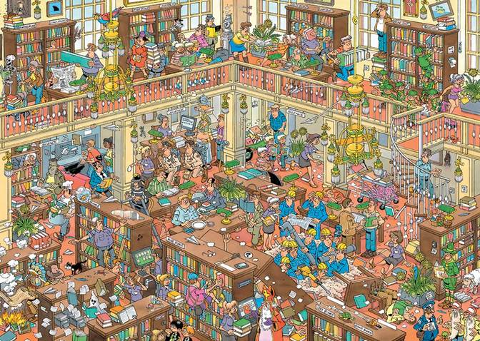 Die Jan-van-Haasteren-Familie verbringt den Vormittag in der Bibliothek und sucht ganz ruhig nach neuem Lesestoff. Aber hier ist alles andere als still! Es gibt einige bemerkenswerte Besucher, die offensichtlich keine Ahnung von den Bibliotheksregeln haben.
