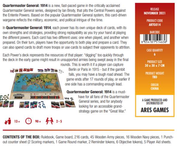 Ares Games Srl (2026)Quartermaster General: 1914 is the next title in the critically acclaimed Quartermaster General series by Ian Brody and creates a narrative of the First World War in Europe, reflecting the military, technological, and social changes that occurred over the following four years.