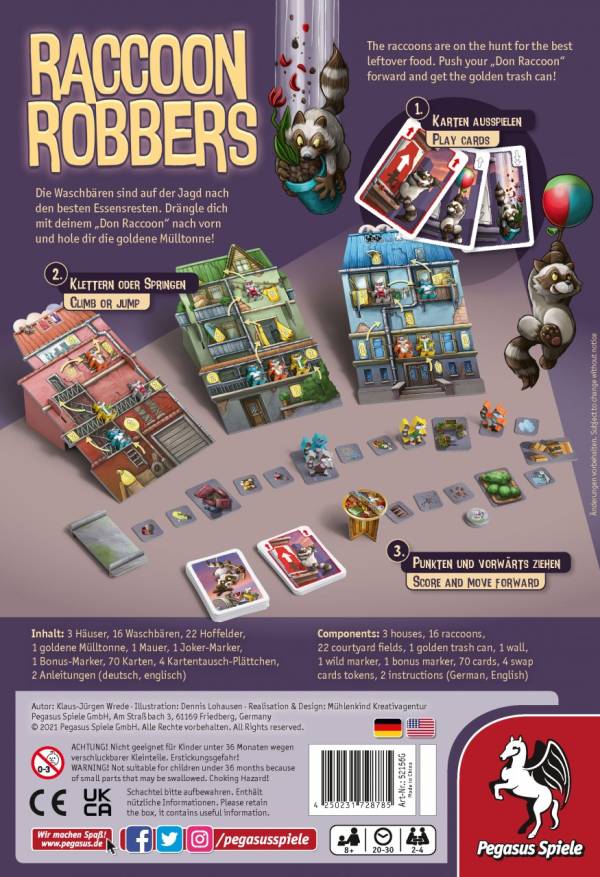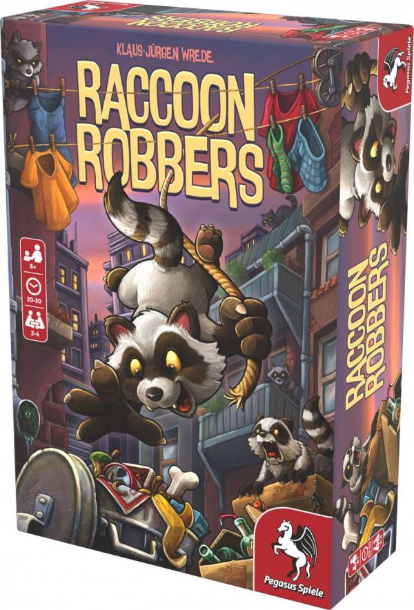 Pegasus Spiele (2021)Wilde Waschbären belagern die Stadt! Bei Raccoon Robbers gehen die Waschbären auf Nahrungssuche. Geschickt klettern sie an Häusern empor und schwingen sich mit einem gewagten Sprung in den Hinterhof. Dort wartet auch schon „Don Raccoon“, der Boss der Bande. Er hat nur ein Ziel vor Augen: Die goldene Mülltonne! Schon wird gerangelt und geschubst was das Zeug hält, denn beim Essen hört bekanntlich die Freundschaft auf!