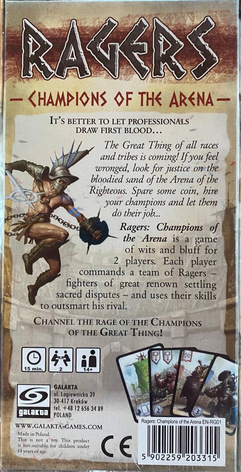 Ragers: Champions of the Arena is a game of wits and bluff for two players. Each player becomes a head of a team of Ragers — powerful fighters who settle disputes between tribes during the Great Thing that lasts for three days. During the game, players play cards depicting brave warriors and representing different types of attacks and special actions. By doing so, they gain glory points (GPs) over three rounds of fighting, and whoever gains the most GPs becomes victorious.