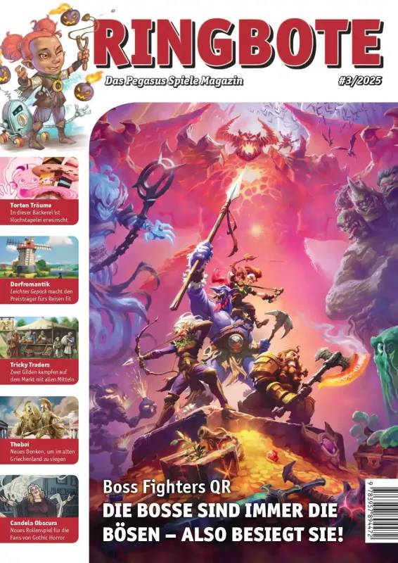 Pegasus Spiele (2025)Seit 2020 erscheint der Ringbote - unabhängig vom Online-Spielemagazin - in komplett neuer Optik vier Mal im Jahr in gedruckter Form. Als offizielles Pegasus Spiele-Magazin bietet der Ringbote neben Artikeln zu allerlei Produkten aus dem Verlags- und Vertriebssortiment auch spannende Einblicke hinter die Kulissen des Spieleverlags.
