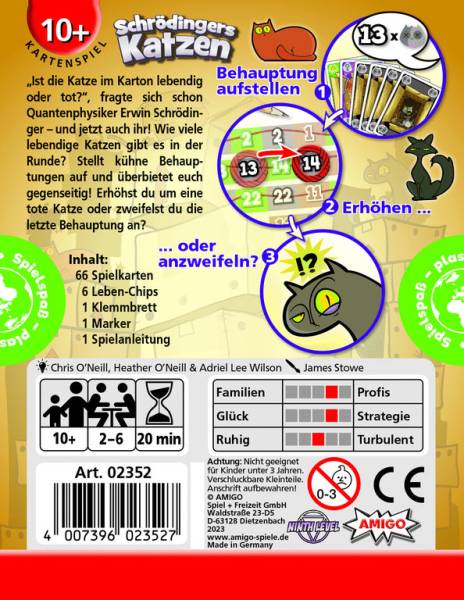 Wie viele lebendige Katzen gibt es in der Runde? Nacheinander stellen die Spielenden kühne Behauptungen auf und überbieten sich dabei gegenseitig. Um eine tote Katze erhöhen oder die letzte Behauptung anzweifeln?