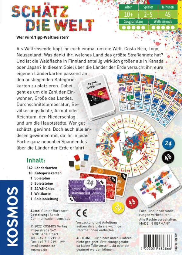 Inhalt: 142 Länderkarten, 18 Kategroiekarten, 1 Spielplan, 5 Spielsteine, 5 24/48-Chips, 1 Weltkarte, 1 Spielanleitung>