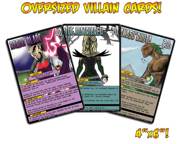 Greater Than Games (2013)The first draft of Sentinels of the Multiverse included oversized villain cards that had the art for that villain and all of that character's game text on one big card.