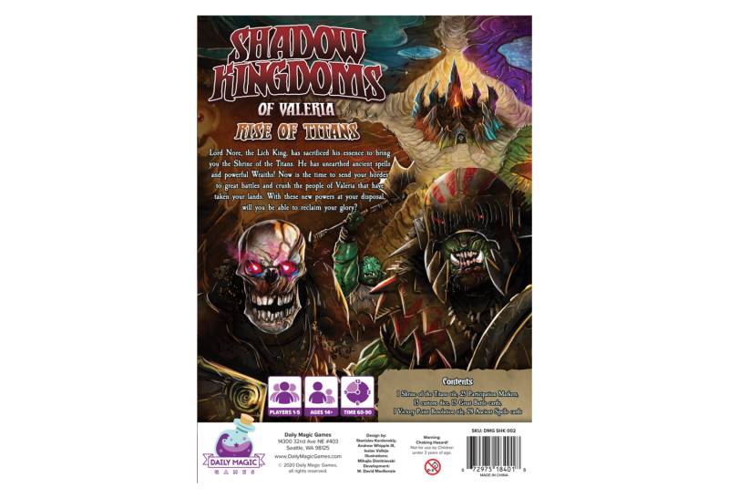 Introduction: This expansion includes four modules: Shrine of the Titans, Great Battles, Ancient Spells, and Wraith Dice. You may play with one or more modules, mixing and matching as you please. Modules can all be included in a game of Shadow Kingdoms of Valeria, though we recommend that you have a firm understanding of the base game and each module before including them all at once.