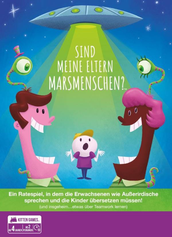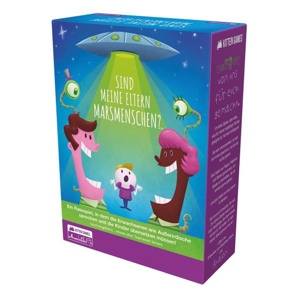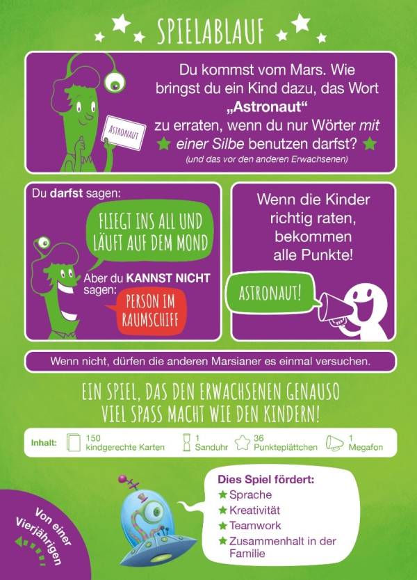 Mebo21,90 €Das Kinderspiel Sind meine Eltern Marsmenschen? ist ein witziges Wortratespiel, bei dem die Erwachsenen im Marsianer-Team wie Außerirdische sprechen und die Kinder im Menschen-Team müssen übersetzen. Das Sprechen wird den Marsmenschen dadurch erschwert, dass sie kindgerechte Begriffe auf den Wortkarten nur mit einsilbigen Wörtern erklären dürfen. Wenn die Kinder den richtigen Begriff durch das Megafon rufen, bekommen alle Punkte! Wenn nicht, dürfen die anderen Marsianer es einmal versuchen.