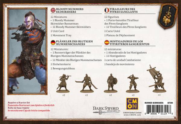CMON (2021)Es gibt zahlreiche Söldnertruppen in Westeros. Jede davon muss einen Weg finden, um sich von den anderen abzuheben und zu unterscheiden. Die Plänkler des blutigen Mummenschanzes erreichen dies durch äußerst auffällige Kleidung und Makeup, sowie durch ihr närrisches Verhalten. Aber nur ein Narr würde über sie als Narren des Schlachtfelds denken. Ihre Kleidung ist kein Zeichen einer freundlichen Gesinnung. In Wahrheit dient sie mehr als Warnung, denn der Blutige Mummenschanz ist als eine der grausamsten Söldnertruppen in ganz Westeros bekannt.