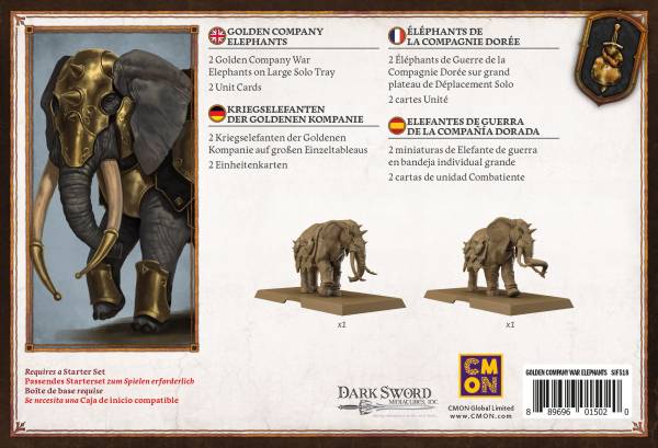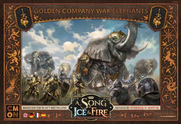 CMON (2022)Die Einheiten-Erweiterung A Song of Ice & Fire - Golden Company War Elephants (Kriegselefanten der Goldenen Kompanie) bringt insgesamt zwei große Miniaturen in die beliebte Welt des epischen Tabletop-Spiels.