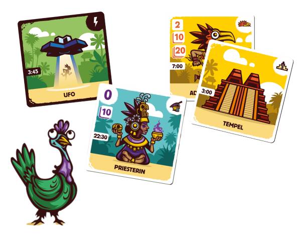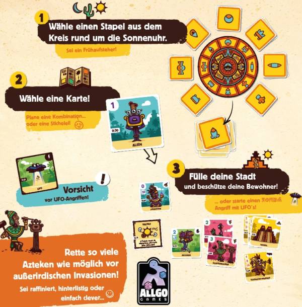 Wer welche Karte zuerst ausspielt, entscheidet die aufgedruckte Uhrzeit. Danach geht alles schnell: Karten aufdecken, Effekte abhandeln, Ufos starten, Tempel bauen, Azteken retten – oder verlieren. Und während du versuchst, deine Bevölkerung in Sicherheit zu bringen, sinkt der Himmel immer tiefer und die Kartenstapel werden dünner. Das Spiel endet, sobald zwei Stapel leer sind oder der Himmel voller Ufos hängt. Dann wird abgerechnet: Wer hat die meisten Punkte? Wer hat die meisten Leute gerettet? Und wer ist einfach komplett untergegangen?