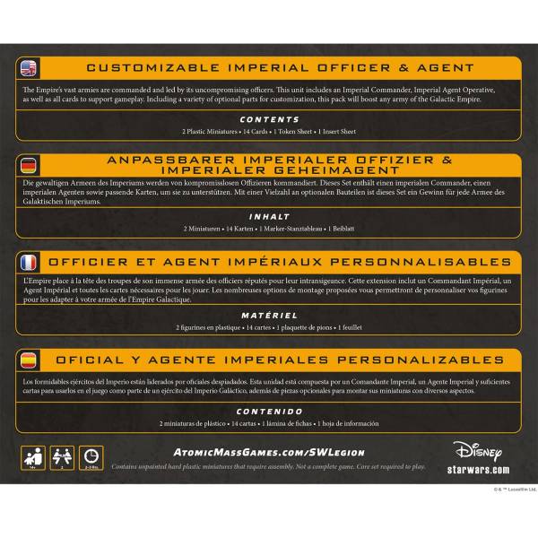Atomic Mass Games (2025)Das Set Anpassbarer imperialer Offizier & imperialer Geheimagent für das Miniaturenspiel Star Wars™: Legion enthält einen imperialen Commander, einen imperialen Agenten sowie passende Karten, um sie zu unterstützen. Mit einer Vielzahl an optionalen Bauteilen ist dieses Set ein Gewinn für jede Armee des Galaktischen Imperiums. Es enthält über 20 optionale Teile, aus denen ihr beim Zusammenbau eurer Miniaturen wählen könnt, was eine riesige Auswahl an individuellen Anpassungsmöglichkeiten für jeden Charakter bietet.