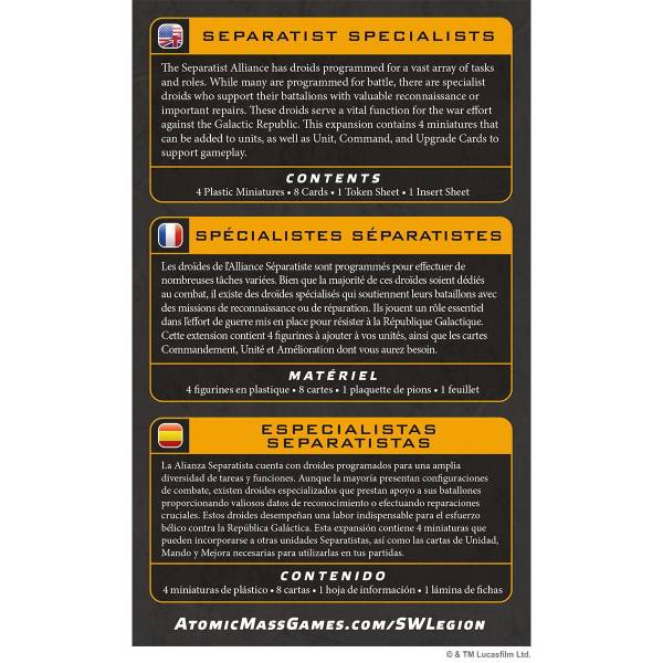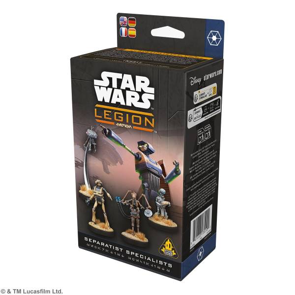 Die Box Spezialisten der Separatisten-Allianz für das Miniaturenspiel Star Wars™: Legion enthält 4 Miniaturen, die zu Einheiten hinzugefügt werden können, sowie passende Einheiten-, Kommando- und Aufwertungskarten.