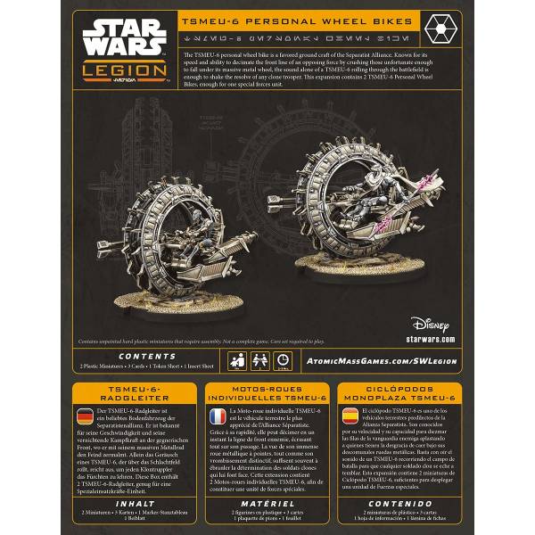 Diese Box enthält 2 TSMEU-6-Radgleiter für das Miniaturenspiel Star Wars™: Legion, genug für eine Spezialeinsatzkräfte-Einheit.