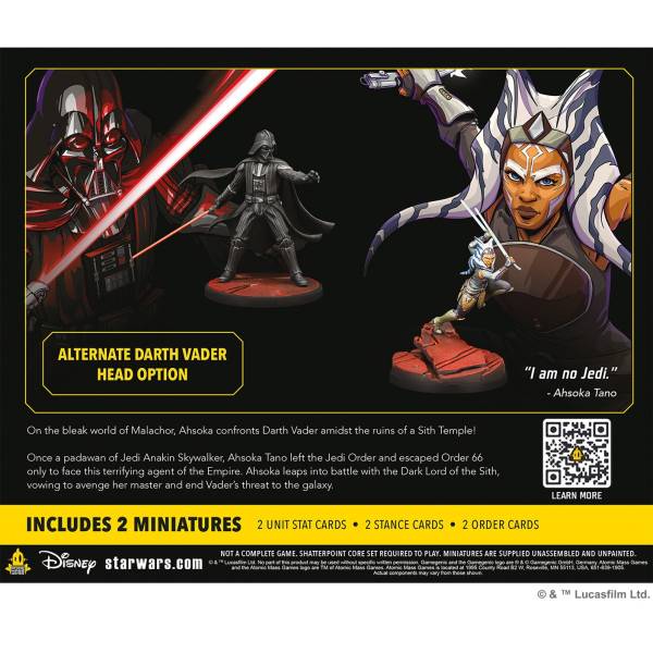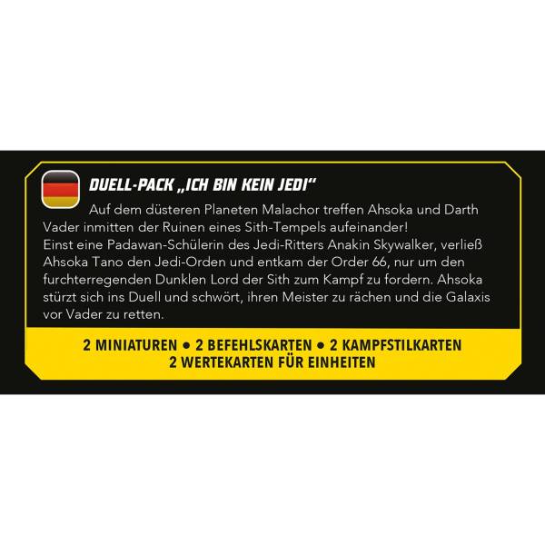 Atomic Mass Games (2025)Im Duell-Pack "Ich bin kein Jedi" für das Miniaturenspiel Star Wars™: Shatterpoint treffen Ahsoka Tano und Darth Vader auf dem düsteren Planeten Malachor aufeinander. Einst eine Padawan-Schülerin des Jedi-Ritters Anakin Skywalker, verließ Ahsoka Tano den Jedi-Orden und entkam der Order 66, nur um den furchterregenden Dunklen Lord der Sith zum Kampf zu fordern. Ahsoka stürzt sich ins Duell und schwört, ihren Meister zu rächen und die Galaxis vor Vader zu retten.