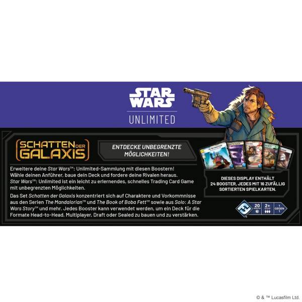 Fantasy Flight Games DE (2024)Begebt euch in eine Galaxis unbegrenzter Möglichkeiten mit Star Wars™: Unlimited! In diesem leicht zu erlernenden, schnellen Trading Card Game schlüpft ihr in die Rollen bekannter Star Wars-Charaktere und liefert euch aufregende Gefechte. In dem Booster-Display für das zweite Set Schatten der Galaxis befinden sich 24 Booster. Jeder Booster enthält 16 Karten, darunter: 1 Anführerkarte, 1 Basis-/Markerkarte, 9 gewöhnliche Karten, 3 ungewöhnliche Karten, 1 seltene oder legendäre Karte sowie 1 Premium-Foilkarte.