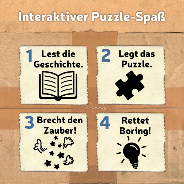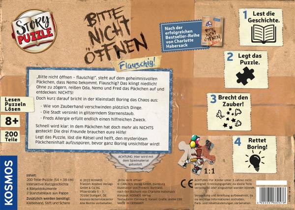 In der Kleinstadt Boring ist immer etwas los! Nemo und seine Freunde Oda und Fred erleben ein neues Abenteuer. Und die Spielerinnen und Spieler sind dabei! Sie tauchen ein in eine exklusive Kurzgeschichte aus der Bestseller Kinderbuch-Reihe "Bitte nicht öffnen". Dann wird gepuzzelt! Auf dem fertig zusammen gelegten Wimmelbild Puzzle geht der Spielspaß weiter! Hier sind viele kleine Rätsel und Suchspiele versteckt. Kurze Begleittexte führen die Puzzlerinnen und Puzzler ab 8 Jahren von einer Aufgabe zur nächsten und treiben so die Story voran. Das Abenteuer geht weiter und wird interaktiv erlebbar. Dieses besondere Story-Puzzle ist ein cooles Geburtstagsgeschenk!