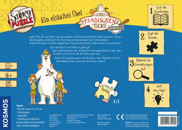 Einsatz für Eisbär Murphy! Um den aufregenden Fall zu lösen, braucht er die Unterstützung von Ida, Benni und ihren magischen Tierfreunden Rabbat und Henrietta. Eine exklusive Kurzgeschichte für Erstleserinnen und Erstleser ab 6 Jahren liefert den Einstieg in den Fall am Johannisplatz: Mitten im Sommer schließt plötzlich die Eisdiele! Was steckt dahinter? Auf dem gepuzzelten Wimmelbild verstecken sich viele Rätsel, die im Laufe der Geschichte gelöst werden. Ein toller Stickerbogen, mit dem man das eigene Eis kreieren kann, macht dieses Story-Puzzle zu einem besonderen Erlebnis. Für Fans der Kinderbuch-Reihe "Die Schule der magischen Tiere ermittelt" ist das Puzzle ein tolles Geburtstagsgeschenk.
