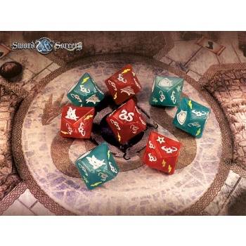 This set includes eight special Sword & Sorcery® dice - four red/attack dice, four blue/ defense dice - with engraved and colored icons. Fight through exciting adventures with your favorite Hero and your own set of dice!