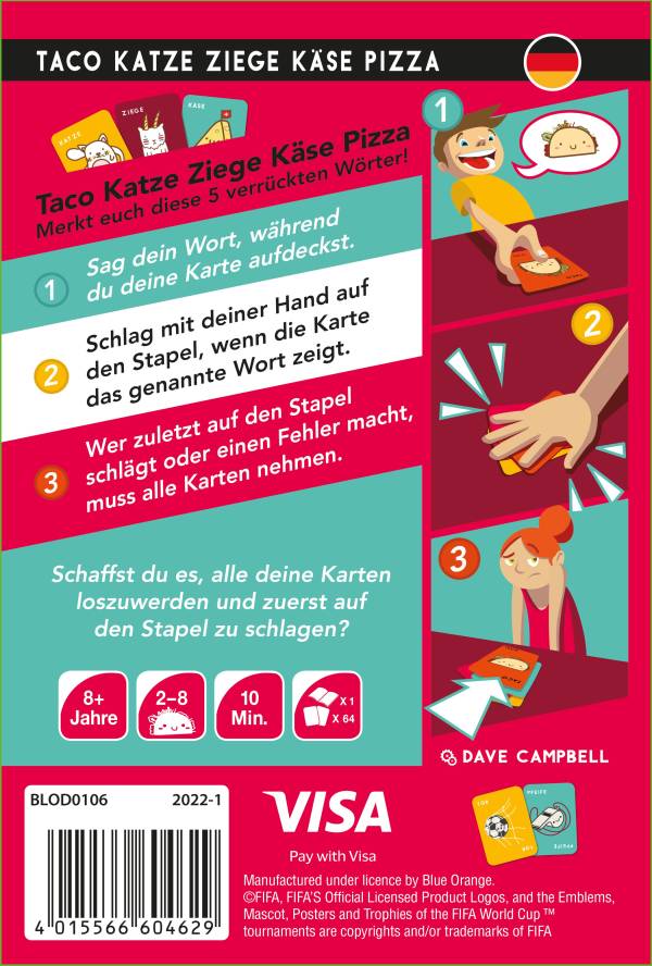 blue orange (2022)Taco Katze Ziege Käse Pizza (FIFA-Edition) bringt das verrückte Reaktionsspiel im neuen Design auf die heimischen WM-Partys. Neben den thematischen Illustrationen warten auch neue Spezialkarten wie Pfeife oder gelbe Karte auf die Spieler. Die Sonderedition zur FIFA Fussball-Weltmeisterschaft Katar 2022™ ist ein von der FIFA offiziell lizenziertes Produkt.
