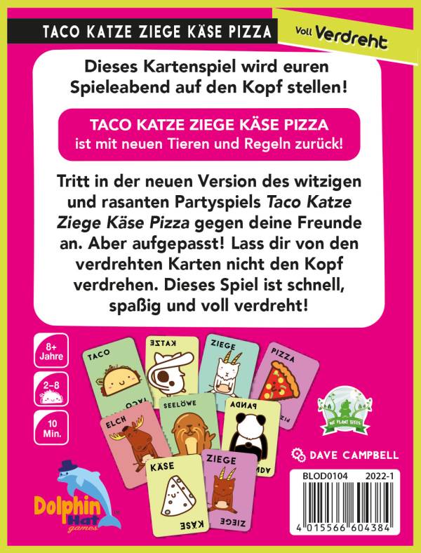 blue orange (2022)Taco Katze Ziege Käse Pizza: Voll Verdreht ist eine eigenständige Variante des verrückten Reaktionsspiels Taco Katze Ziege Käse Pizza. Das Spiel läuft grundsätzlich nach den altbekannten Regeln ab, wird allerdings um einen verdrehten Kniff erweitert: Einige Karten zeigen die verrückten Abbildungen von hinten. Auf diese Rückseitenkarten muss im richtigen Moment mit dem Handrücken geschlagen werden. Außerdem sind mit Elch, Panda und Seelöwe drei brandneue Tiere dabei, die nachgemacht werden müssen.