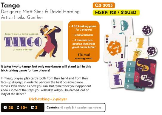 Grail Games (2025)It takes two to tango, but only one dancer will stand tall in this trick-taking game for two players!