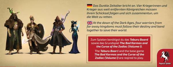 Dies ist kein Grundspiel. Zum Spielen werden das Teburu Board und das Grundspiel The Bad Karmas and the Curse of the Zodiac Vol. 1 benötigt. Zum Spielen von TBK ist eine kostenlose digitale App erforderlich (deutsche Version verfügbar).