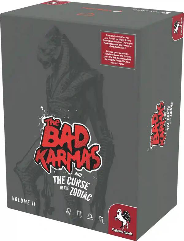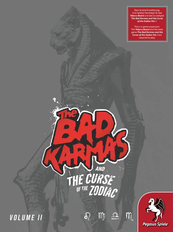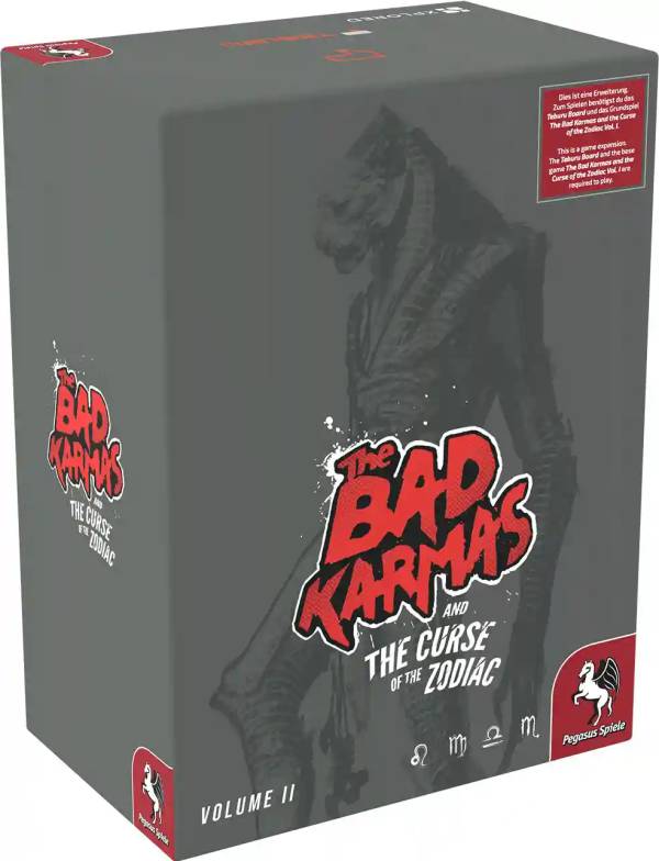 Pegasus Spiele (2026)Der Kampf der Bad Karmas um das Überleben der Menschheit nimmt kein Ende. In dieser Erweiterung von The Bad Karmas and the Curse of the Zodiac treten die Spielenden gegen Leo, Virgo, Libra und Scorpio an.