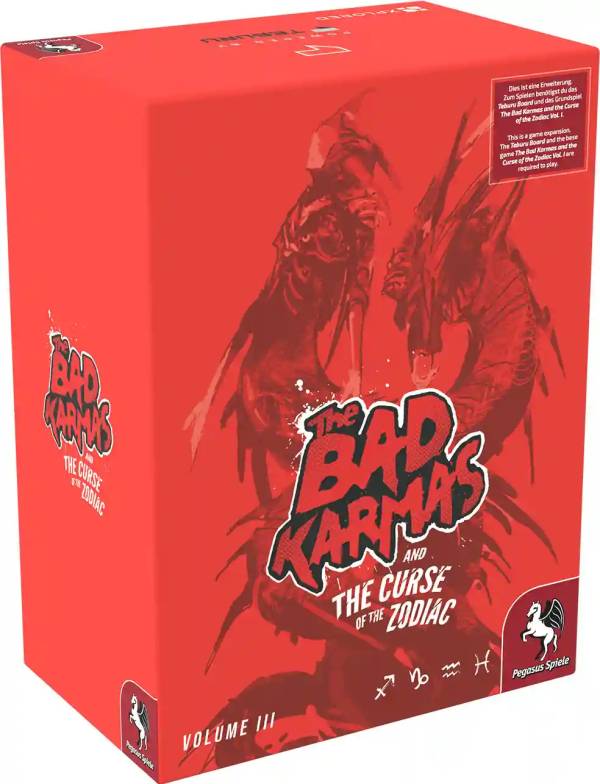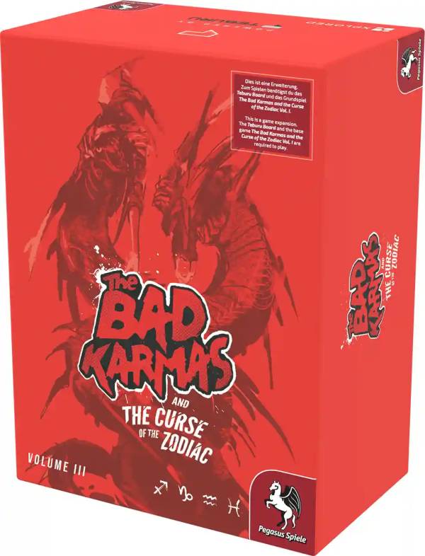 Pegasus Spiele (2026)Das finale Kapitel im Kampf der Bad Karmas um das Überleben der Menschheit! In dieser Erweiterung von The Bad Karmas and the Curse of the Zodiac treten die Spielenden gegen die letzten 4 Zodiacs an: Saggitarius, Capricorn, Aquarius und Pisces.