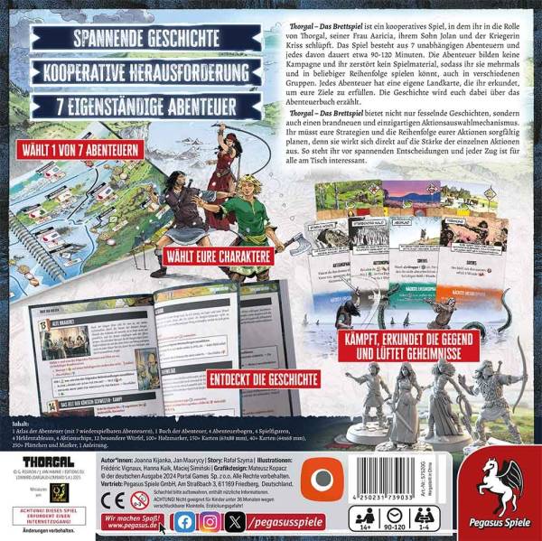 Portal Publishing (2024)Thorgal – Das Brettspiel ist ein kooperatives Abenteuerspiel mit fesselnder Geschichte, das auf der bekannten gleichnamigen Fantasy-Comic-Reihe basiert. Die Spielenden schlüpfen in die Rollen von Thorgal, Aaricia, Jolan oder Kriss und erkunden in sieben unabhängigen Abenteuern verschiedene Gebiete. Das Buch der Abenteuer führt die Spielenden zu verschiedenen Orten, an denen sie auf Ressourcen, Feinde, sowie auf unerwartete Begegnungen stoßen und sich in spannenden Kampfsituationen wiederfinden. Im Zentrum des Spiels steht neben dem Erzählaspekt ein innovativer Aktionsmechanismus, welcher der Gruppe gute Zusammenarbeit, strategische Entscheidungen und sorgfältige Planung abverlangt. Jede Aktion beeinflusst dabei auch den Verlauf der Geschichte.