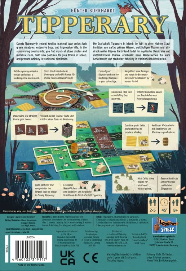 Lookout Spiele (2023)Tipperary ist ein familienfreundliches Plättchen-Legespiel mit irischem Thema. Durch geschicktes Platzieren ihrer Plättchen versuchen die Spieler, sich eine möglichst wertvolle Landschaft zusammenzupuzzeln. Doch allein der magische Steinkreis entscheidet, aus welchen Teilen die Spieler wählen dürfen. Das macht es nicht leicht, die größte Schafweide oder die besten Getreidefelder für die eigene Destille anzulegen. Am Spielende zeigt sich, wer geschickt genug taktiert hat, um die erfolgreichste Gemeinde in Tipperary zu haben.