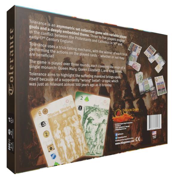 Spiel direkt eG distributes both German and English editions of this game. This entry is for the English version - for that reason, all the following texts are only in English. If you are looking for the German version, see "Tolerance (German)Tolerance is an asymmetric set collection game with variable player goals for 3 to 5 players representing the conflict between Protestants and Catholics in 16th and early 17th Century England. This game uses a trick-taking mechanic, where the winner of each trick gets to perform the played cards' actions, whether beneficial or not.
