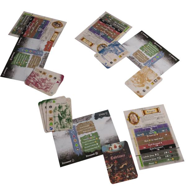 The game is played over three rounds, spanning the reigns of Queen Mary, Queen Elizabeth I, and King James, with each round covering the reign of one monarch.