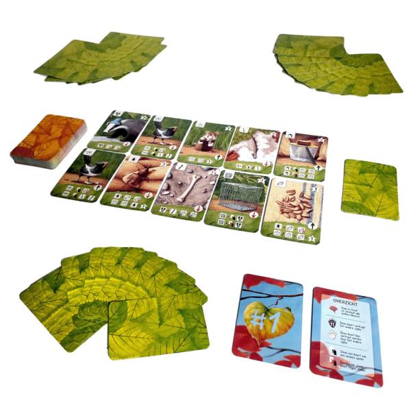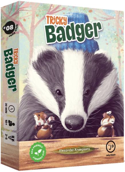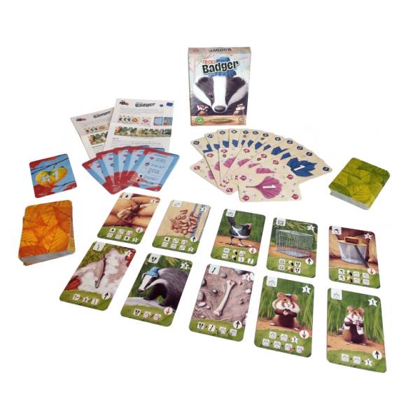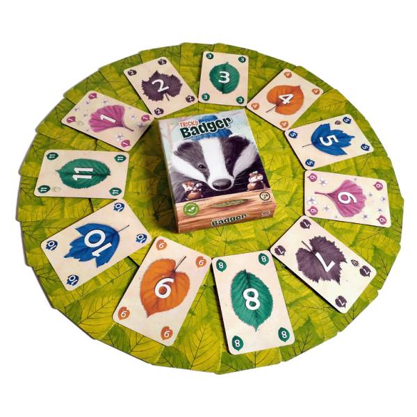Tricky Badger is a set-collection, trick-taking card game. The game lasts five rounds, and each player starts the round with a hand of nine cards, with pink always being trump. Ten collection cards are placed face up from the deck.