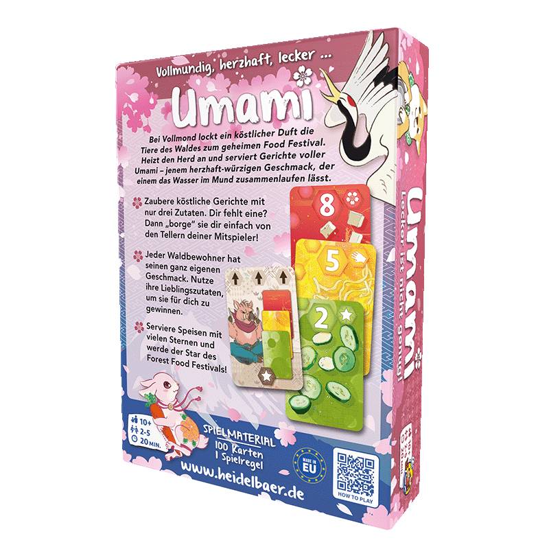 UMAMI bietet clevere Entscheidungen, lockeren Spielspaß und eine hohe Wiederspielbarkeit für jede Spielrunde. Ärgert die anderen Küchenchefs, indem Ihr euch an deren Zutaten bedient. Spielende aller Altersklassen ab zehn Jahren finden gleichermaßen Geschmack bei diesem schnellen und einfach zu lernenden Kartenspiel. Das Auge isst bekanntlich mit und so hat die japanische Illustratorin Ikuko Nakai bei UMAMI eine liebevolle Tierwelt in Ghibli-artigen Stil mit einer Portion Humor geschaffen, die optisch herausragend ist und einmal mehr in Kawaii-Ästhetik (=Supersüßer Optik) zu überzeugen weiß.