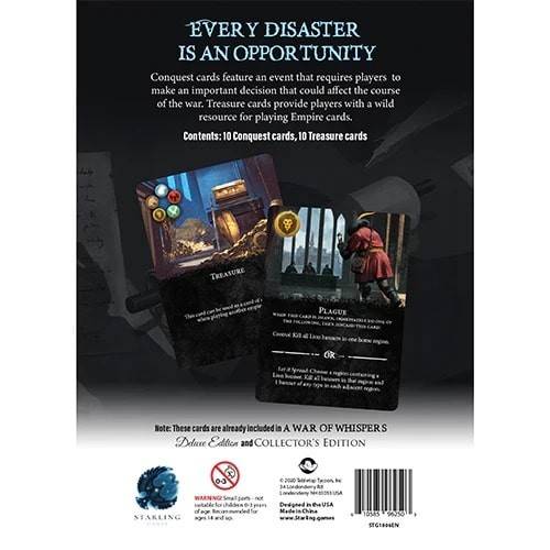 Tabletop Tycoon (2023)An expansion pack including the 10 Conquest and 10 Treasure cards. Conquest Cards represent a unique event that takes place. The effects of the Conquest card take place as soon as the card is drawn. Treasure cards act as a wild card when playing another empire card. The Conquest and Treasure cards are already included in the Collector's Edition.