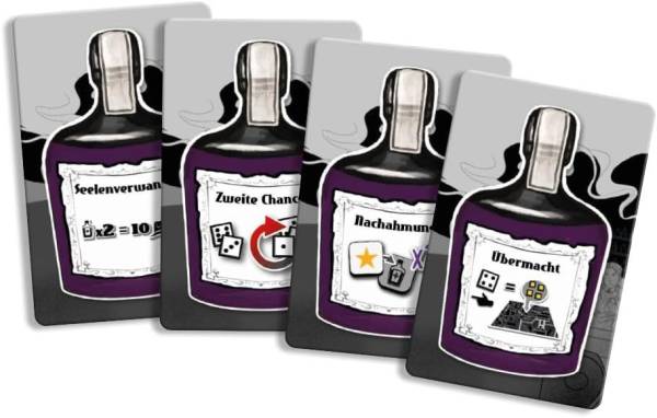 Dunkle überÂnatürliche Kräfte und mysteriöse ZauberÂtränke können dir dabei helfen! Neben Tränken wie "Verführung" und "Seelenverwandt" gibt es auch die "Zweite Chance": Du darfst beliebig viele Würfel neu werfen - für bessere Aktionen oder um dein Gegenüber zu ärgern! Fragt sich nur, warum die verboten sind …